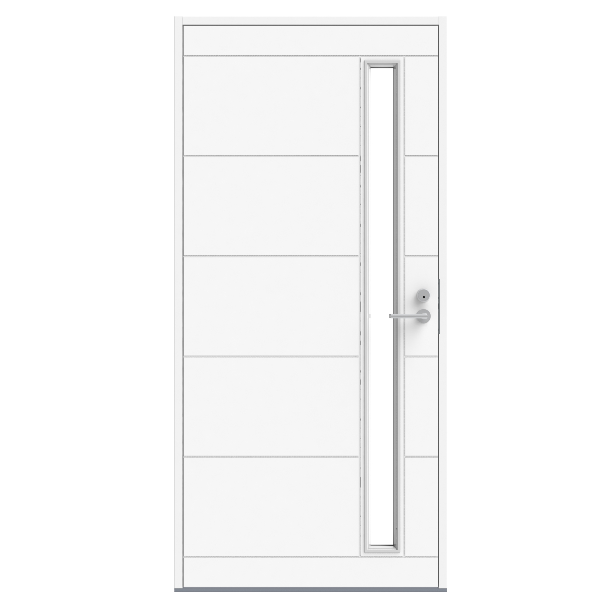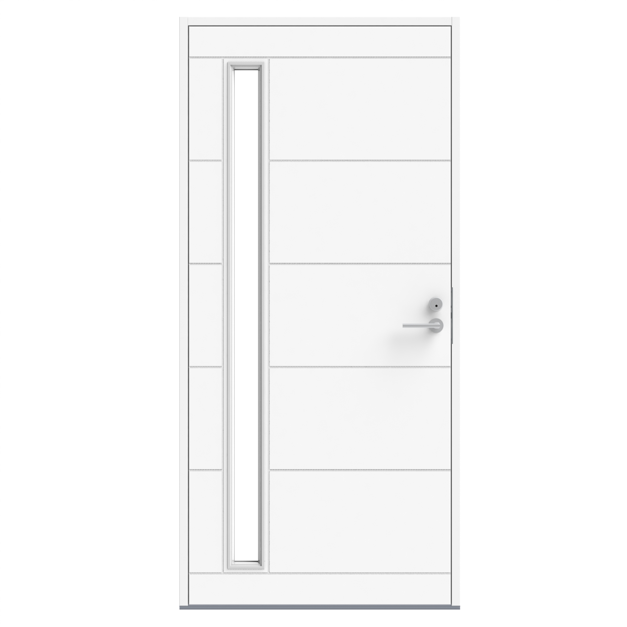 Tähän malliin suositellaan Stockholm-painiketta tai pitkävedintä. Pitkävedin tuo tyyliä ovesi avaukseen ja ulkonäköön. Pitkävedin korostaa oven arvokkuutta ja kruunaa kotisi sisäänkäynnin. Ovi aukeaa avaimella kääntämällä tehden oven käyttämisestä kevyttä ja vaivatonta. Vakiolasina on kirkas lasi.