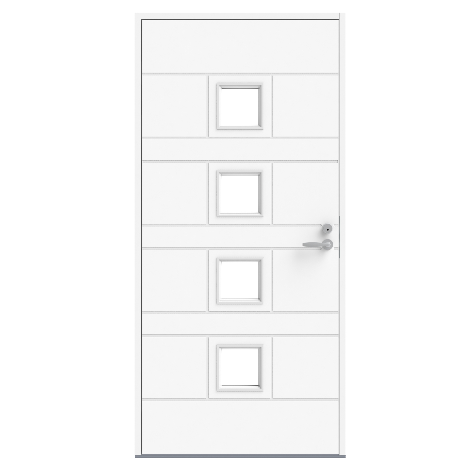 Tähän malliin suositellaan Stockholm-painiketta tai pitkävedintä. Pitkävedin tuo tyyliä ovesi avaukseen ja ulkonäköön. Pitkävedin korostaa oven arvokkuutta ja kruunaa kotisi sisäänkäynnin. Ovi aukeaa avaimella kääntämällä tehden oven käyttämisestä kevyttä ja vaivatonta. Vakiolasina on kirkas lasi.