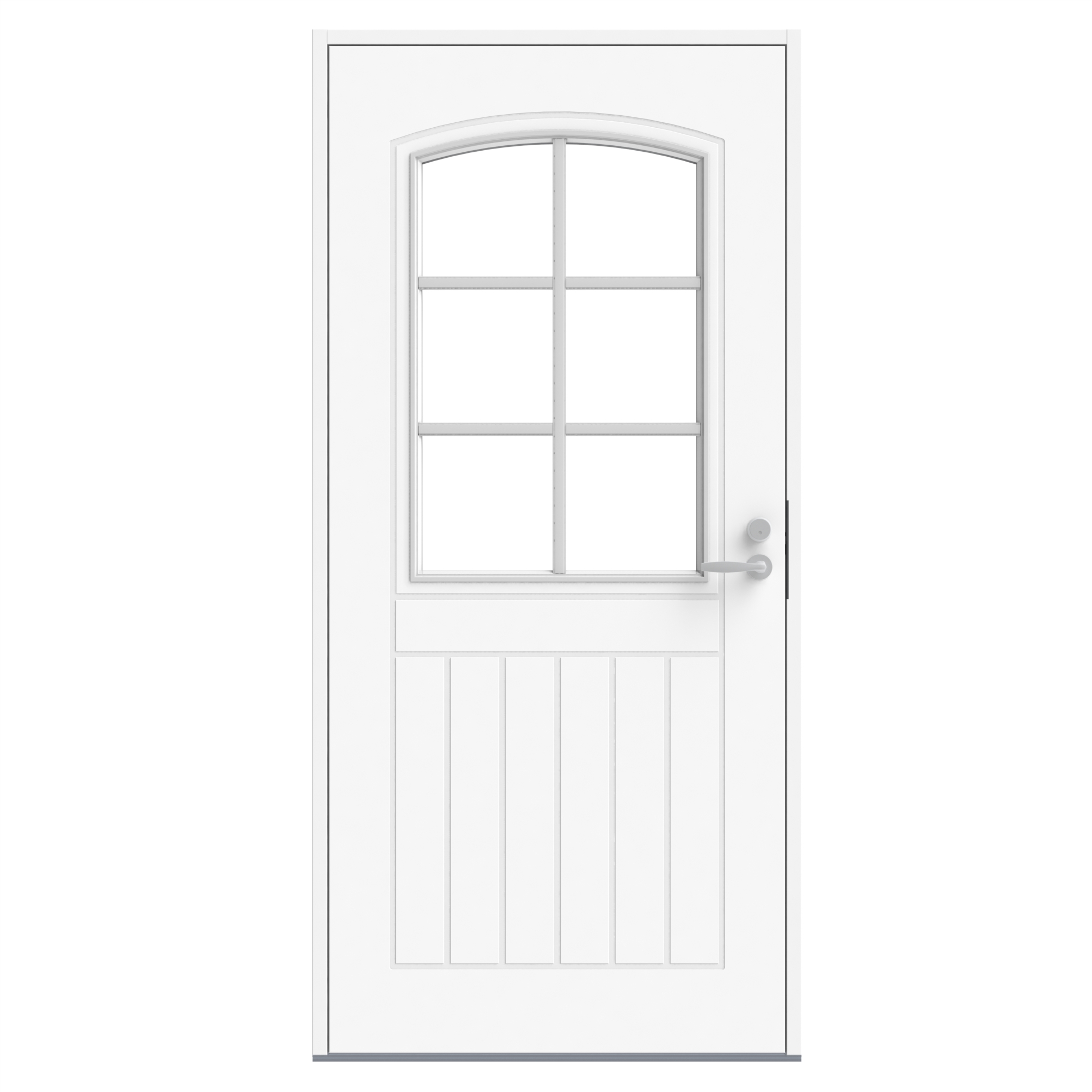 Perinteisen tyylikäs ulko-ovi Klassikko D2 tarjoaa sekä kaarevaa että kulmikasta muotokieltä. Yläreunastaan pyöristetty reilun kokoinen lasiaukko on varustettu koristeellisella ristikolla ja kokonaisuuden kruunaa klassista pystylaudoitusta muistuttava kuviouritus.